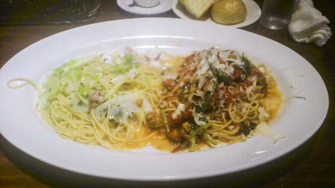 メニューはいろいろありますが、私はランチメニューの中から、2種類のパスタ盛り合わせをオーダー。大盛りが無料だったので勿論大盛りで。