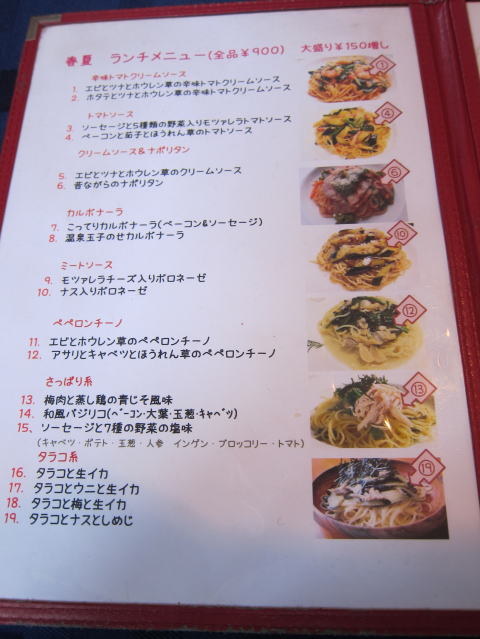 昼過ぎに入りましたが、1階は満席で、2階へ。人気店のようですね。パスタがメインの様です。ランチメニューは色々ありました。