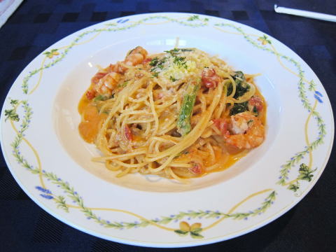 私は、この中から、エビとツナとホウレン草の辛味トマトクリームソースパスタにしました。それに、サラダセット。まずは、サラダの登場。