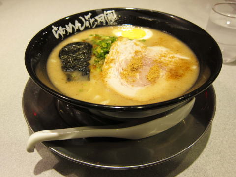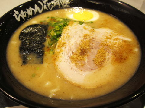 メニューにも書いてある通り、スープは豚骨ベースに魚貝系だしがプラスされたダブルスープです。かなりコッテリとしたスープですね。麺はストレートの中細麺です。具材はあっさりと、海苔、チャーシュー、玉子です。チャーシューの上にも魚粉がかかっています。味はまあ普通にWスープのラーメン。特にそれ以上の特徴は無いかな。チャーシューは薄いですが、結構美味しいです。本来の喜多方ラーメンは醤油ベースの透き通ったスープだと思いますので、これは亜流のメニューということでしょうか・・・。