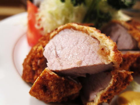 なんか凄く綺麗なとんかつです。まず特徴的なのが、いわゆる「衣が立った」という感じではありません。一瞬天ぷらか?と思ってしまいます。ご主人に話しを聞くと、使っているパン粉が物凄く肌理の細かいものを使っているとの事でした。次に、肉の断面が凄く綺麗。ピンク色に揚げあがっています。これがじっくり揚げた成果ですね。