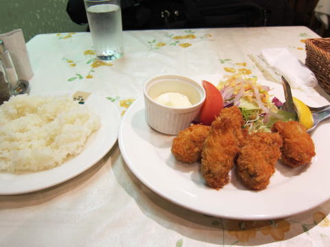 まあ普通にカキフライ定食です。ただ、タルタルソースが濃厚で沢山付いていたり、レモンの搾り器が付いていたり、ちょっとしたところに老舗の感じがしました。肝心の味ですが、サクサクの衣にクリーミーな牡蠣。普通に美味しいです。牡蠣はそれほど大振りではありませんが、まあこんなものでしょう。