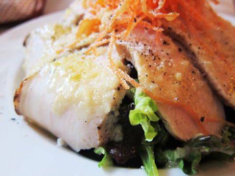 前菜なのに、凄いボリューム。鶏肉もたっぷり乗っています。鶏肉も丁度よくローストされており、美味しいです。