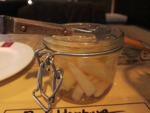 まず、自家製ピクルスが出て来ました。これを食べて料理の出てくるのを待ってくださいという事らしいです。