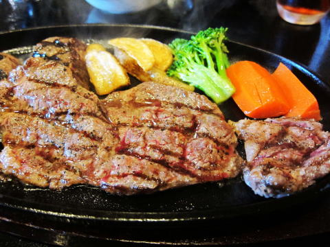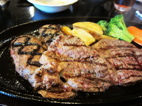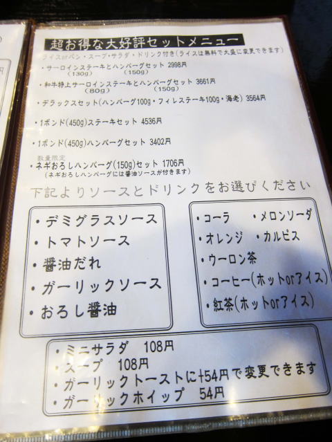サーロインステーキはちょっと薄いですね。ハンバーグは、俵形のハンバーグが二つに切って出されます。焼加減は聞かれませんでしたが、結構レアです。特別特徴がある分けではありませんが、まあ、リーズナブルに楽しめる料理だと思います。