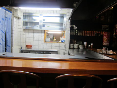 店内は、テーブル席が並び、大きな鉄板を囲むカウンターもあります。こんな感じです。