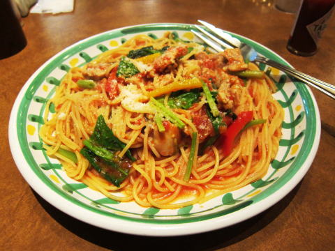 パスタは乾麺で、アルデンテに茹で上がってます。大盛りにしたのでそれなりのボリュームです。味は比較的あっさりですね。メニュー名にある「チキン」は確かに鶏肉が入っていますが、パスタ全体としてチキンらしさを感じるかというとちょっと疑問。風味が感じられません。例えば、鶏肉をあらかじめ焼き目が付くまで焼くとかすると、香ばしさと共に風味が増すと思うのですがどうでしょう。ほうれん草もちょっと量が少ないかな。全体的にはまずく無いですが、いまひとつパンチが無い所が、ファミレスの限界か?
