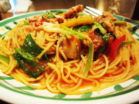 メニューはパスタを中心にピザやサラダなどもあります。私は今日はチキンとほうれん草のトマトソースパスタを大盛りで頂きました。それにサラダを追加オーダー。