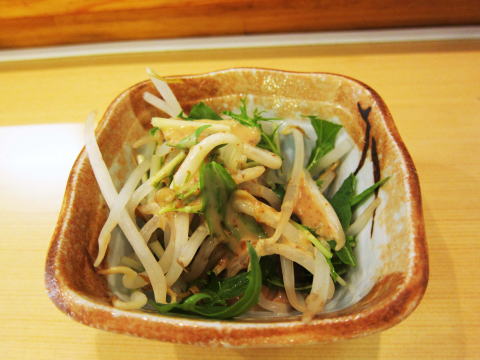 もやしと水菜にゴマドレッシングがかかっています。なかなか美味しい。このサラダを食べ終わらないうちに、もうにぎりが出てきました。