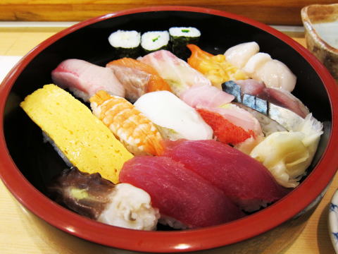 今日は、ホタテ、ほっき貝、鯛、サーモン、はまち、シメ鯖、金目、いか、エビ、玉子、マグロ(赤身)、鳥貝、かっぱ巻き。結構なボリュームですね。
