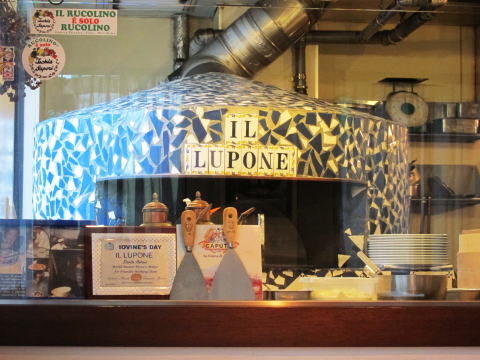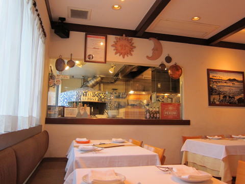 この写真の左側には大きな窓があり、厨房が覗けます。奥にはピザを焼く為の石釜が見えます。