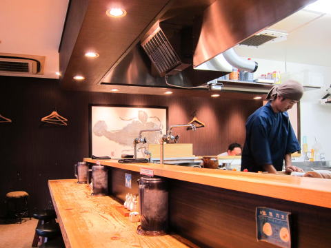 店内に入ると、直ぐ右側に食券の販売機があり、そこで食券を買います。座席は、全てカウンターで12席ですが、結構スペースに余裕があり、狭い感じはしません。こんな感じ。