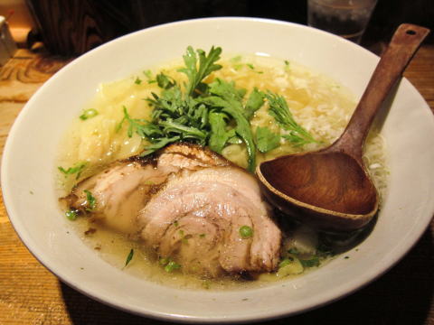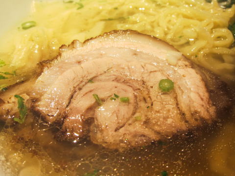 スープは綺麗に透き通っています。美味しそう。一口スープをすすると、優しい旨みが感じられます。塩らー麺というと、細麺を想像しますが、ここは平打ちの中太麺です。ですが、つるつるとした食感で、スープとも合っています。チャーシューは結構味がしっかりと付いています。このスープだともう少しあっさりとしたチャーシューの方が合うような気もします。それに、このらー麺の特徴は、春菊が入っていること。これは厚木店の特徴でもあるようです。この春菊が、スープの脂とマッチして美味しいです。それから、チャーシューの他に、ワンタンも入っています。このワンタン、中に、肉がしっかりと詰まっています。