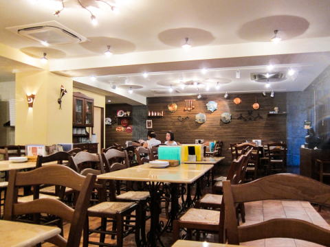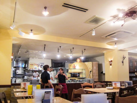 店内に入ると、テーブル席がずらっと並び、大変広いです。正面には、厨房があり、その中に、石釜があります。