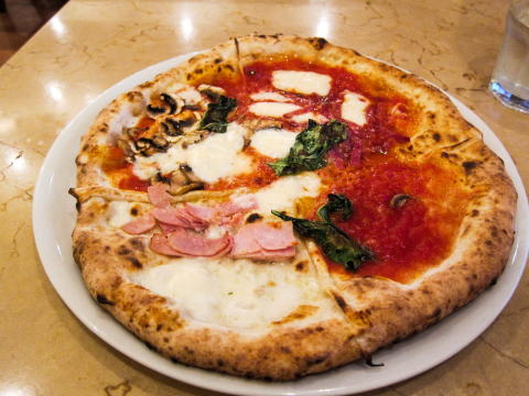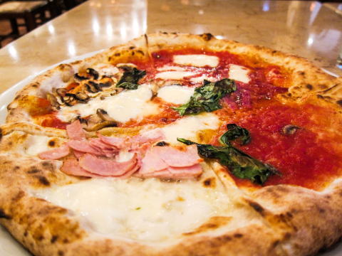 さて、本日のオーダーは、クアトロスタジョーニ。クアトロという名前が付いている通り、ピザが四つの区画に分けられ、それぞれに別の食材が乗っています。食材は、モッツァレラ、アンチョビ、サラミ、マッシュルーム、ハム、バジリコです。