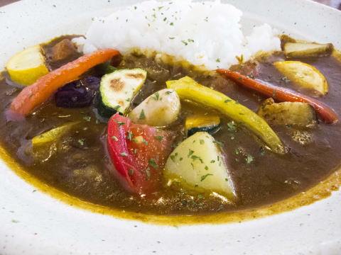 そして、カレーです。焼き野菜が沢山乗っています。美味しそう。