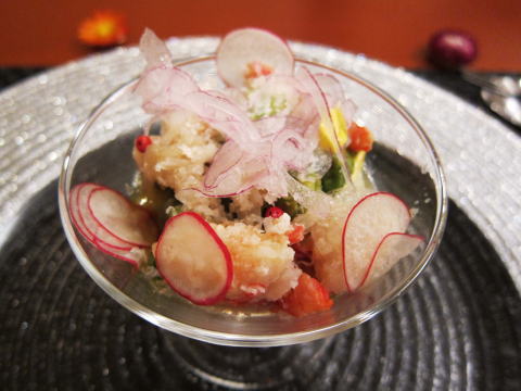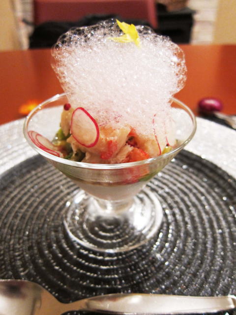 前菜は、北海道産のずわい蟹をつかったタルタル。カクテルグラスの底にはポーチドエッグが入っています。その上にアボガド、そして蟹。一番上には、レモンで作ったドレッシングがあわ立てて盛り付けてあります。非常に手の込んだ一品です。見た目も美しいです。