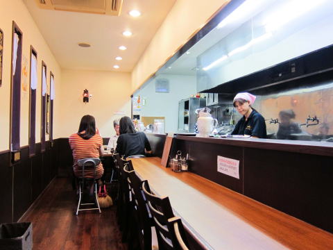ちょっと離れた所に3台分の駐車場もあるので、車でも行けます。さて、店内に入ると、ラーメン店の名残を残すカウンタースタイル。テーブル席は1つ。でもリニューアルされているので、なかなか綺麗でお洒落です。こんな感じです。