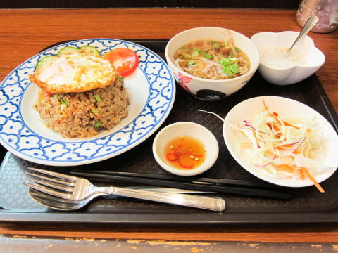 カオはご飯、パットは炒める、つまりチャーハン。ムーは豚肉。豚肉のチャーハンということですね。それに、小ラーメンも付いています。
