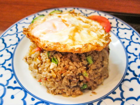 チャーハン、なかなか美味しいです。上に乗った目玉焼きも良い具合に半熟です。