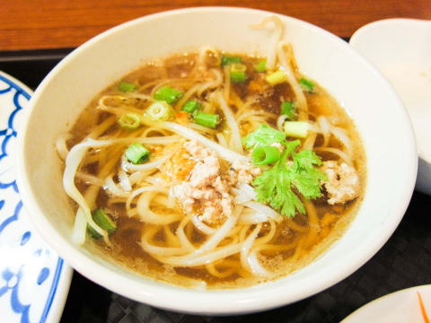 そして、ラーメン。こちらは、タイ風ラーメンなので、ベトナムのフォーの様に、米の粉で作られた白い麺です。スープもコクがあってなかなか美味しいですね。