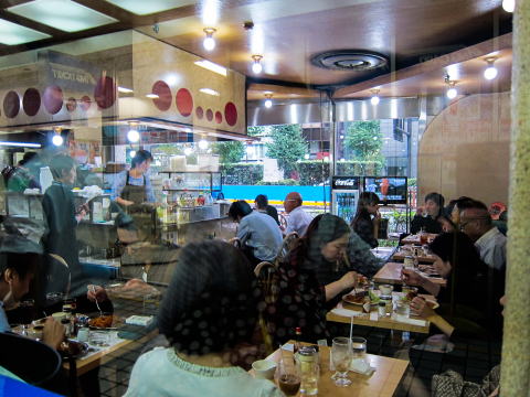 店内はテーブル席とカウンター。ランチ時は行列が出来ていますが、結構回転は速いです。店内はこんな感じ。(外の窓から撮影)