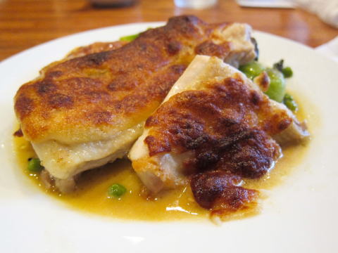 写真は鶏肉が3切れに見えますが、手前2切れが鶏モモ肉。後に隠れているのは、ポテトにチーズパン粉を付けて焼いたものでした。これも美味しいです。