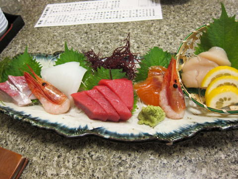 まずつまみに刺身の盛り合わせ。