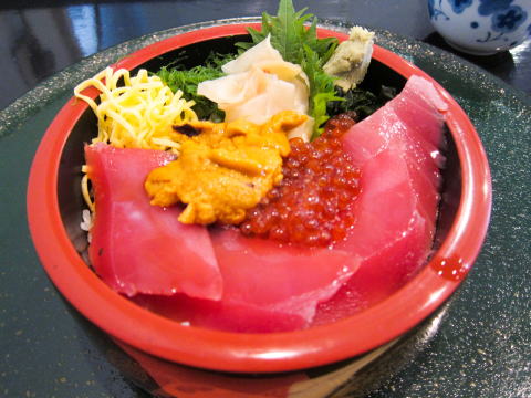 おお、大振りのマグロ。そして、ウニとイクラ。