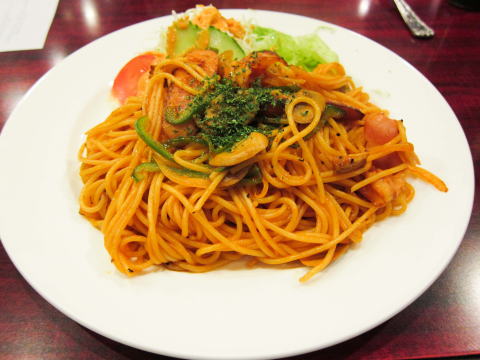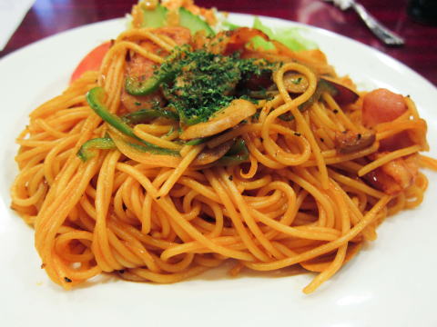 えっ?これナポリタンでしょ?と思いますよね。でもここでは「ポラタ」という料理なんです。使っているパスタは比較的細め。伝統的なナポリタンのように、太めのパスタを一度茹でて、一日置くというようなことはしていないようです。普通にトマトソース味のパスタです。それに、サラダがセットされている。パスタには、ベーコン、ソーセージ、玉ねぎ、マッシュルームで、上にパセリのみじん切り。Yokoham