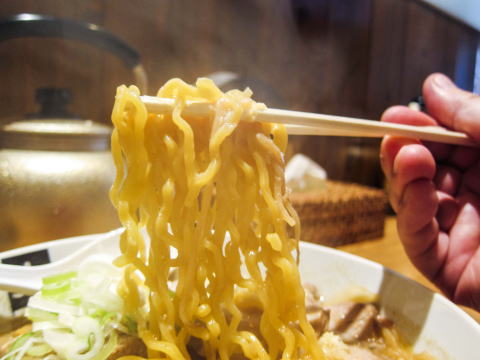 さて、スープを一口。おお、なかなかインパクトのある味噌スープ。ニンニクも効いています。スープはトンコツ、魚介、野菜を煮込んだもののようです。そして、麺は太麺の縮れ麺。チャーシューはかなり厚くて大振りなのが4切れも入っていました。