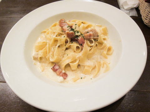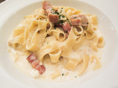 さて今日のオーダーは、フェットチーネです。実際には、フェットチーネのカルボナーラでした。本当は、お肉が食べたかったのですが、焼きあがるのに30分かかると言われて諦めました。そして料理搭乗。
