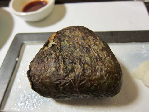 これは弁慶飯。こちらでは有名らしい。お店の名前が「べんけい」ですがお店の名前を取っているわけではなく、本当に弁慶に由来しているようです。おにぎりの周りに味噌を付け、漬物の葉っぱで巻いて、それを焼いています。味噌が焼ける香ばしい香りがします。