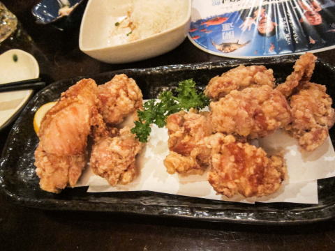 人気の鶏の唐揚げ。写真左が塩、右が醤油の味付け。どちらも美味しいです。