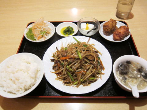程なくして、料理登場です。おお、凄いボリューム。ニラレバの他に、スープ、サラダ、漬物、杏仁豆腐、そして大きな鶏の唐揚げが2つ。