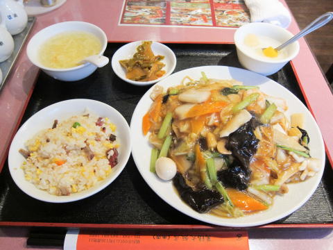 焼きそばの他に、半チャーハン、スープ、杏仁豆腐などが付いています。