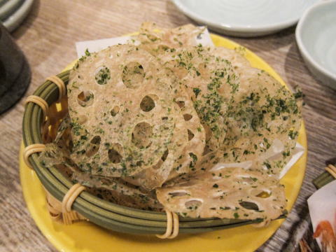 レンコンチップの青海苔かけ。これもパリパリで美味しい。