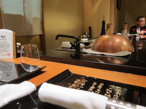 店内はカウンターだけ。カウンターは入り口の近くと奥の2つあります。このお店は入り口で靴を脱いで中に入ります。カウンターは掘りごたつのように足が下ろせるので、楽です。また、お座布団が、前が薄く後が厚みがある作りになっており、座り易くなっています。店内はこんな感じ。