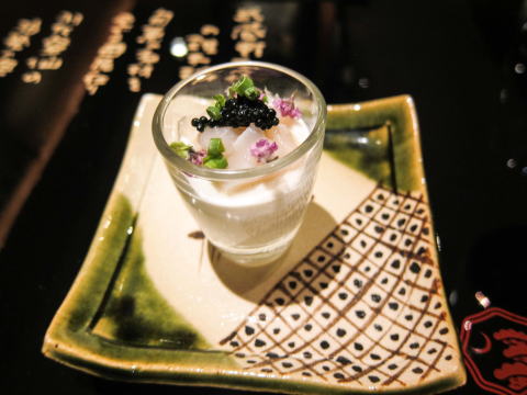 まず、付き出し。アスパラガスのムースの上に、キャビアが乗っています。