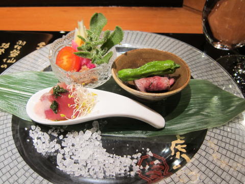 続いて、前菜。ロースとビーフ、カツオ、鎌倉野菜のバーニャカウダ。どれも美味しいですが特に鎌倉野菜が美味しい。アイスプラントの歯ざわりが良いです。