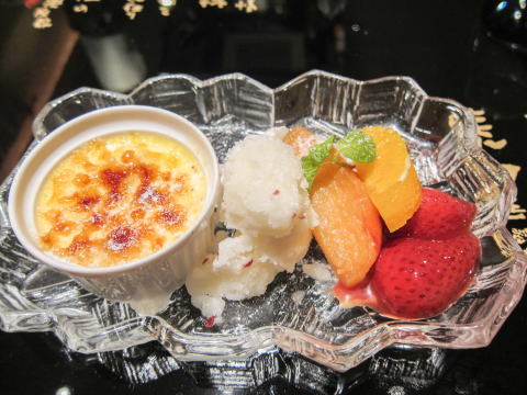 クレームブリュレに、リンゴのシャーベット。と果物。リンゴのシャーベットは本当にリンゴを食べている感じ。クレームブリュレもしつこい甘さが無く、美味しかったです。