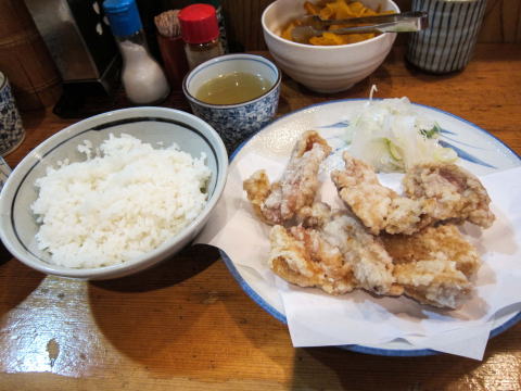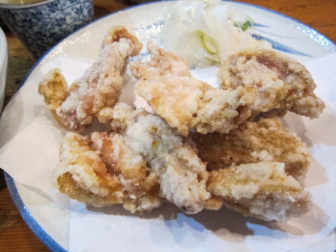 唐揚げは、モモ肉が3切れ、手羽が2切れ。どちらも美味しいです。この唐揚げに、酸味の強い、二杯酢を付けて食べます。から揚げには線キャベツなど付いておらず、ネギだけ。このネギは、付けダレに入れるか、スープに入れる薬味ですね。
