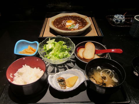 お味噌汁、サラダ、小鉢などが付いています。ビーフシチューは濃厚ですが、くどくは無く美味しいです。ドミグラスソースの味付けが良いですね。お肉は当然軟らかい。