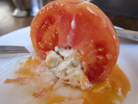 オーダーしたのは、勿論定番の「つばめ風ハンブルグ・ステーキ」です。オーダーすると、まずは、前菜の丸ごとトマトが出てきます。中にはコールスローが入っています。