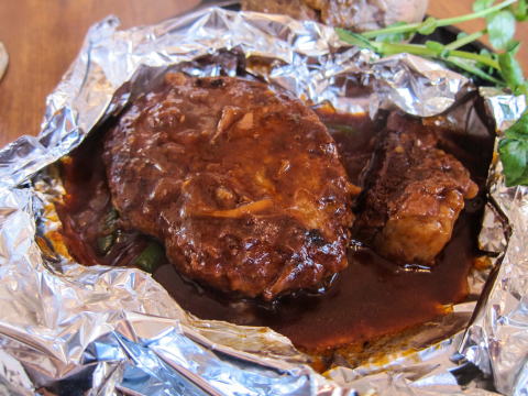 プックリ膨らんだアルミホイルをナイフで切り開く定番のスタイルですね。何だか楽しいです。中には、ハンバーグステーキと大振りの肉の塊。食べ応えがあります。