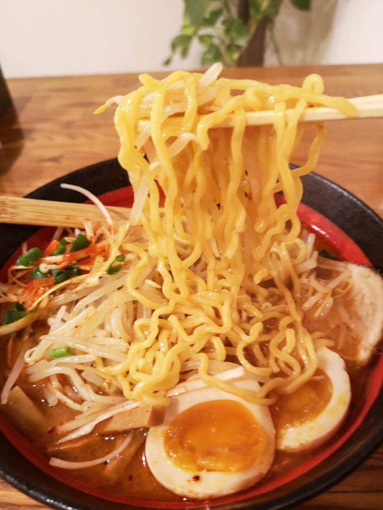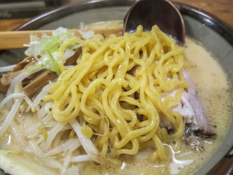 麺は、かん水が多めで、黄色味がつよい中太ちぢれ麺。かなり弾力があります。