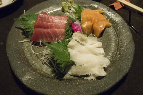 お刺身の盛り合わせ。三崎マグロ、サーモン、ひらめのえんがわ。