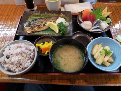 ノルウェー産のサバの塩焼き、お刺身は、ホタテ、イカ、いとより、シメ鯖、マグロ、玉子焼き、長芋のバター焼きと豪華。