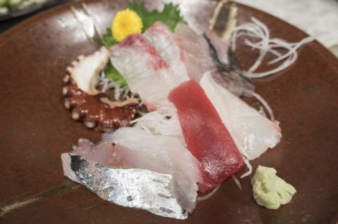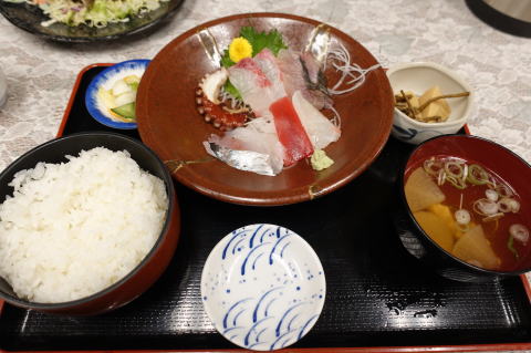 さて、刺身定食登場。鯵、タコ、マグロ、鯛などでしょうか。