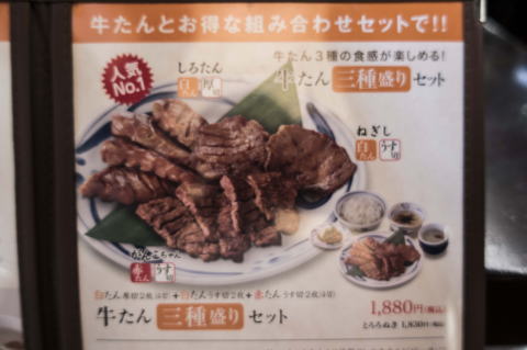 「しろ」はタン元側を厚切りにしたもの。それを薄切りにしたのが、「ねぎし」。そしてタンの先の方を薄切りにしたのが、「がんこちゃん」。先の方は少し肉質が硬いようです。だからがんこちゃん?
